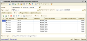 Учет шин и аккумуляторов, устанавливаемых на транспортные средства, ведется по серийным номерам. Для отражения в учете операций монтажа/демонтажа комплектующих используется документ «Ремонтный лист транспортного средства», где можно указать сведения о месте установки комплектующего, выработке на момент монтажа/демонтажа и техническом состоянии.