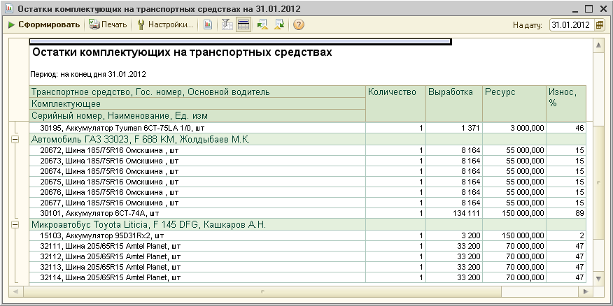 Для регистрации износа шин и аккумуляторов используется механизм регистрации выработки транспортных средств документом «Путевой лист». Т.е. выработка транспортного средства автоматически может быть отнесена к комплектующим, установленным на данное транспортное средство.