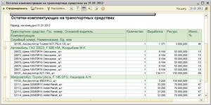 Для получения сведений о наличии комплектующих, установленных на транспортные средства и степени их износа, предназначен отчет «Остатки комплектующих на транспортных средствах».