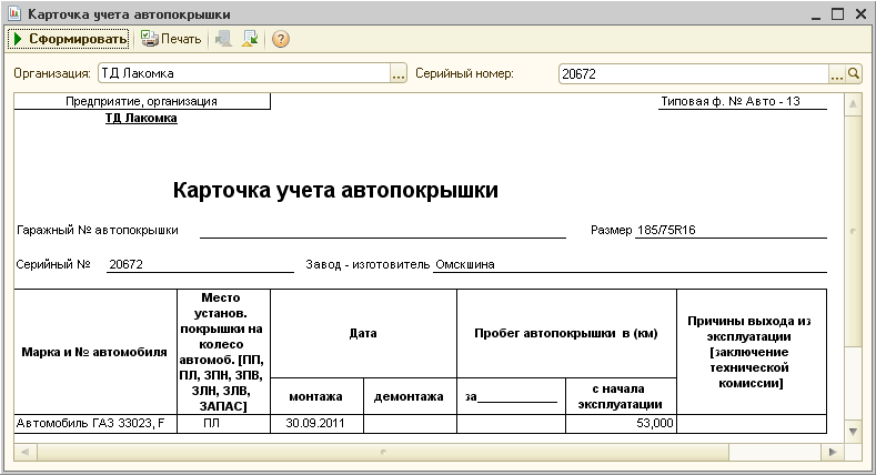 Отчеты «Карточка учета автопокрышки» и «Карточка учета аккумулятора» используются для отражения истории эксплуатации комплектующего: когда и на какие транспортные средства устанавливалось комплектующее, выработка с начала эксплуатации и за период работы на транспортном средстве и т.д.