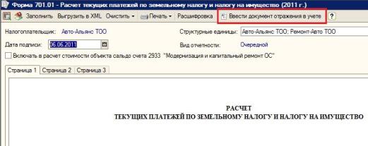 Для того, чтобы в типовой конфигурации «Бухгалтерия для Казахстана» отразить начисление транспортного, земельного и имущественного налога необходимо воспользоваться формами регламентированной отчетности: формой 701.00 «Расчет текущих платежей по налогу на транспортные средства» и формой 701.01 «Расчет текущих платежей по земельному налогу и налогу на имущество». А также непосредственно самой декларацией 700.00 «Декларация по земельному налогу, налогу на транспортные средства и налогу на имущество». Для формирования проводки по начислению налога необходимо после того, как будет сформирован отчет, нажать на кнопку «Ввести документ отражения в учете», которая находится в верхней командной панели формы регламентированного отчета.