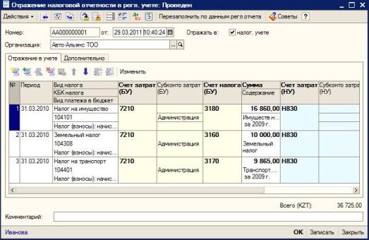 Для того, чтобы в типовой конфигурации «Бухгалтерия для Казахстана» отразить начисление транспортного, земельного и имущественного налога необходимо воспользоваться формами регламентированной отчетности